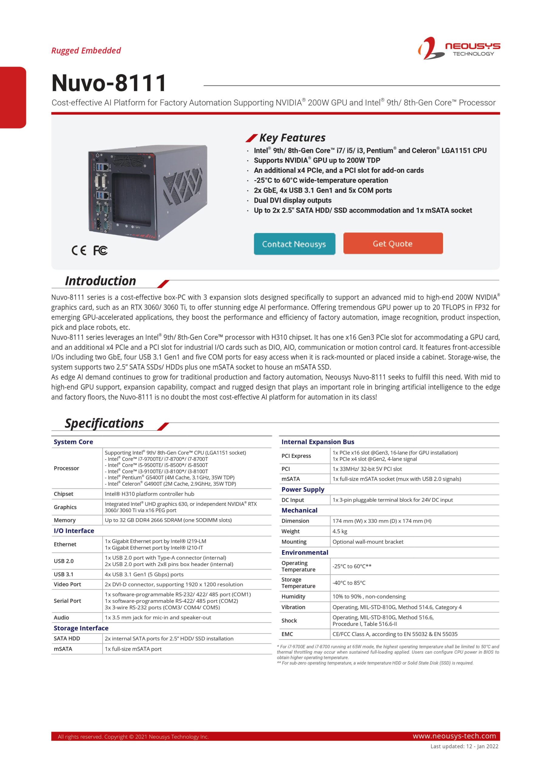 As edge AI demand continues to grow for traditional production and factory automation, Neousys Nuvo-8111 seeks to fulfill this need. With mid to high-end GPU support, expansion capability, compact and rugged design that plays an important role in bringing artificial intelligence to the edge and factory floors, the Nuvo-8111 is no doubt the most cost-effective AI platform for automation in its class!